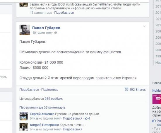 Павел Губарев предложил денежное вознаграждение за поимку губернатора Днепропетровщины Игоря Коломойского