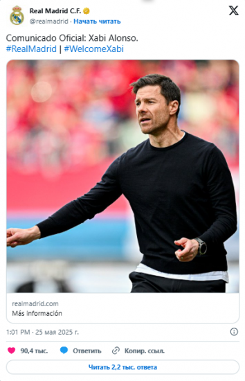 В понедельник, 26 мая, в 13:30 по Киеву Хаби Алонсо будет представлен как главный тренер «Реала», после чего даст пресс-конференцию.