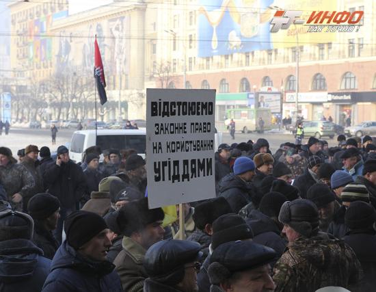 Протестующие стоят с плакатами: «Відстоюємо законне право на користування угіддями», «Мисливці - законні охоронці природи», «нет - частным охотничьим хозяйствам на Купянщине».