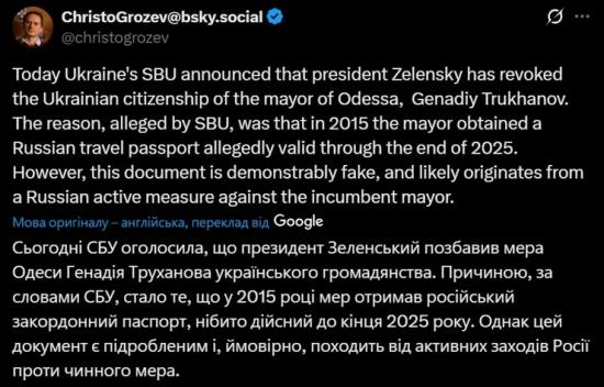 «Сегодня СБУ объявила, что Президент Зеленский лишил мэра Одессы Геннадия Труханова украинского гражданства. Причиной, по словам СБУ, стало то, что в 2015 году мэр получил российский загранпаспорт, якобы действующий до конца 2025 года. Однако этот документ является поддельным и, вероятно, происходит от активных мер России против действующего мэра», — говорится в заметке журналиста в соцсети «Х».