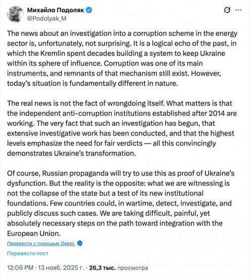 «Новость о расследовании коррупционной схемы в энергетическом секторе, к сожалению, не вызывает удивления. Это логическое продолжение прошлого, когда Кремль десятилетиями создавал систему, чтобы удержать Украину в своей сфере влияния.