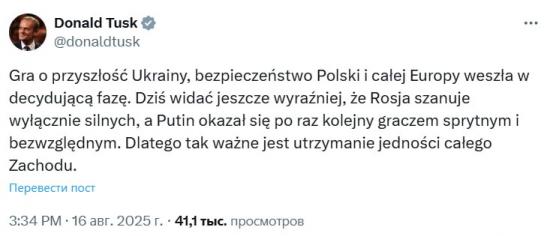 «Игра за будущее Украины, безопасность Польши и всей Европы вступила в решающую фазу. Сегодня ещё очевиднее, что Россия уважает только сильных, а Путин в очередной раз доказал, что он хитрый и беспощадный игрок.