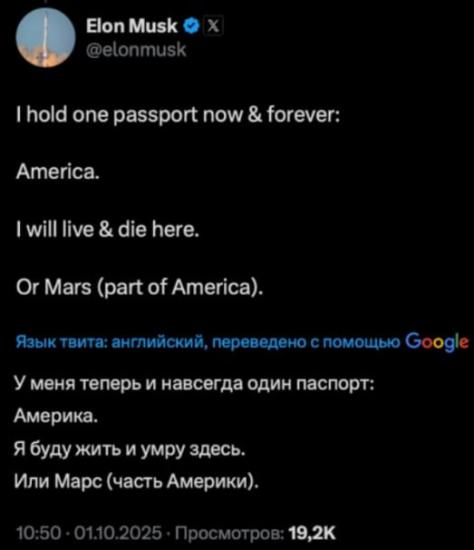 «У меня один паспорт сейчас и навсегда — американский. Я буду жить и умру здесь. Или на Марсе (часть Америки)».