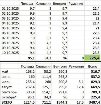 За первую декаду месяца поступило около 225 млн кубов, и по итогам октября ожидается примерно 700 млн кубометров импорта.