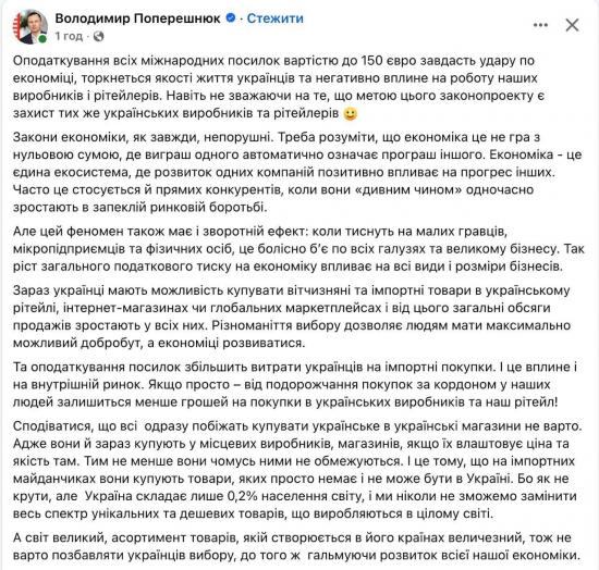 «Обложение налогами всех международных посылок стоимостью до 150 евро нанесёт удар по экономике, затронет качество жизни украинцев и негативно повлияет на работу наших производителей и ритейлеров. Даже несмотря на то, что целью этого законопроекта является защита тех же украинских производителей и ритейлеров. Налогообложение посылок увеличит расходы украинцев на импортные покупки. И это повлияет и на внутренний рынок.