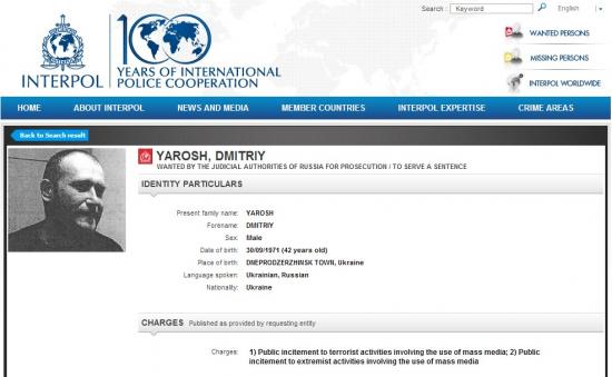 На сайте Интерпола в разделе "Разыскиваемые персоны" говорится о том, что 42-летний уроженец Днепродзержинска Ярош разыскивается судебными органами России для уголовного преследования и/или отбывания наказания. Пункты обвинения - "публичное подстрекательство к террористической деятельности" и "публичное подстрекательство к экстремистской деятельности", связанные с использованием средств массовой информации". Тех, у кого есть информация о местонахождении Яроша, призывают связаться с полицией.