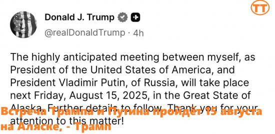 «Долгожданная встреча между мной, президентом США и президентом России Владимиром Путиным состоится в пятницу, 15 августа 2025 года, в великом штате Аляска. Дополнительная информация будет представлена позже», - написал Трамп.