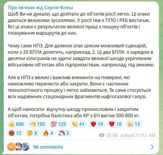 "Эти два БПЛА с зарытом в десятки кило не могут нанести серьёзный ущерб укрепленных военным объектам или предприятиям, например, под землей. Но у НПЗ есть большие и важные элементы на поверхности, которые невозможно перенести или закрыть. Они являются частью технологического процесса и легко поджигаются. То же касается всех надземных стационарных фрагментов нефтегазовой отрасли.
