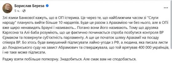 Береза говорит, что выход нардепов из фракции станет стартом процесса потери контроля Офиса президента над Радой, а также "началом пути Арахамии на должность спикера Рады".