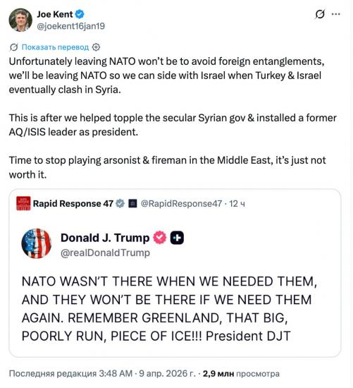«Мы выйдем из НАТО, чтобы встать на сторону Израиля, когда Турция и Израиль в конечном итоге столкнутся в Сирии. И это после того, как мы помогли свергнуть светское сирийское правительство и поставили президентом бывшего лидера «Аль-Каиды» и ИГИЛ. Пора перестать играть в поджигателя и пожарного на Ближнем Востоке - это просто не стоит того», - написал Кент в Х.