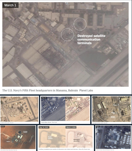 • Кувейт: три радиолокационных купола на базе Кэмп-Арифджан были повреждены или разрушены; а на авиабазе Али-эль-Салем по меньшей мере 8 зданий или сооружений, расположенных рядом с инфраструктурой спутниковой связи, были повреждены или разрушены;