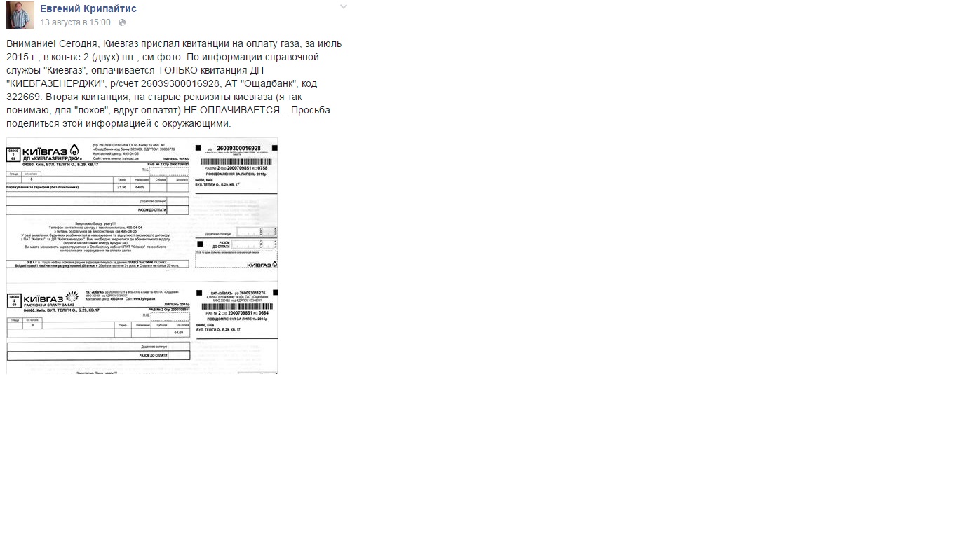 «Внимание! Сегодня, Киевгаз прислал квитанции на оплату газа, за июль 2015 г., в кол-ве 2 (двух) шт. По информации справочной службы "Киевгаз", оплачивается ТОЛЬКО квитанция ДП "КИЕВГАЗЕНЕРДЖИ", р/счет 26039300016928, АТ "Ощадбанк", код 322669. Вторая квитанция, на старые реквизиты киевгаза (я так понимаю, для "лохов", вдруг оплатят) НЕ ОПЛАЧИВАЕТСЯ!».