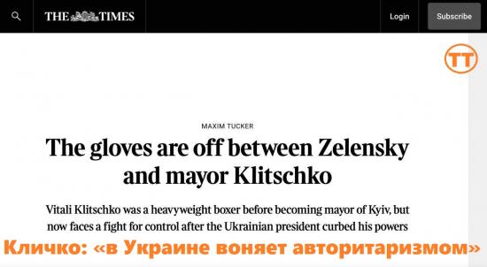 В интервью изданию The Times Кличко заявил: «Это искоренение демократических принципов и институтов под прикрытием войны. Однажды я сказал, что в нашей стране попахивает авторитаризмом. Теперь им воняет».