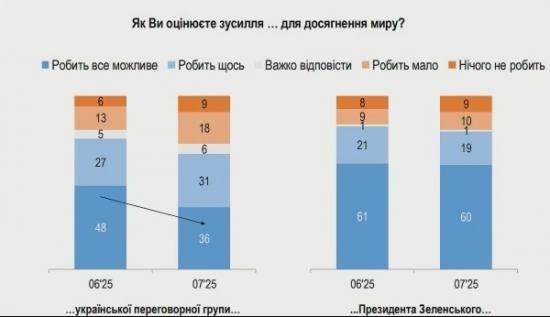 «Оценка усилий украинской переговорной группы по достижению мира снизилась: в июне 48% респондентов считали, что она «делает все возможное», а в июле это мнение разделяют 36».
