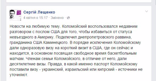"Новости на любимую тему. Коломойский воспользовался недавним разговором с послом США для того, чтобы избавиться от статуса невъездного в Америку. Подключил днепропетровского раввина, гражданина США Каминецкого. В порядке исключения Коломойскому дали одноразовую визу на короткий визит в США, где он сейчас и находится, в основном посвящая свободное время баскетбольным матчам. Членам семьи Коломойского, в отличие от него, дали десятилетние визы. Правда, в какой именно паспорт Коломойскому поставили визу - украинский, израильский или кипрский - источники не уточняют" - говорится в сообщении.
