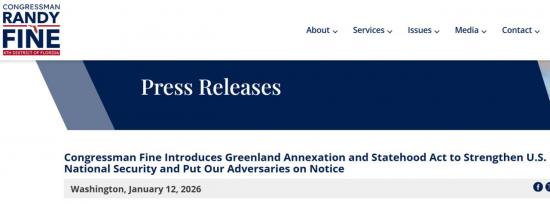 Конгрессмен-республиканец Рэнди Файн внёс законопроект об «аннексии и предоставлении статуса штата» Гренландии со стороны США, - сайт Конгресса