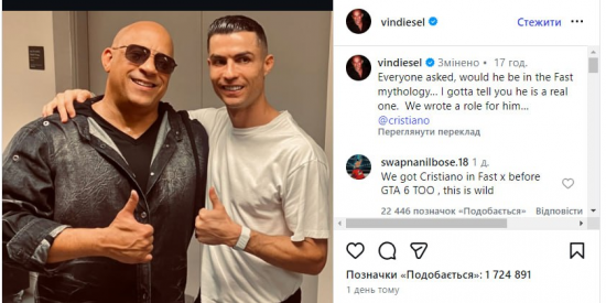 Вин Дизель рассказал, что для легендарного футболиста подготовлена роль.