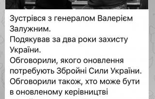 «Зустрівся з генералом Валерієм Залужним. Подякував за два роки захисту України. Обговорили, якого оновлення потребують Збройні Сили України. Обговорили також, хто може бути в оновленому керівництві Збройних Сил України. Час для такого...