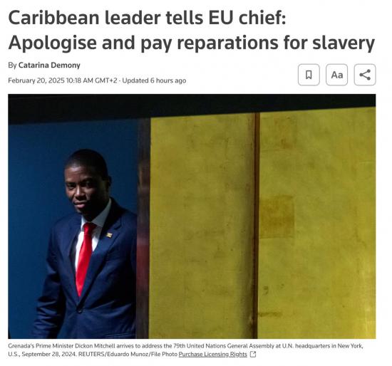 Мы обязаны сделать это ради себя и будущих поколений человечества и обеспечить признание (рабства) преступлением против человечности, а также принести соответствующие извинения и выплатить компенсацию и добиться того, чтобы международное сообщество признало, что это никогда не должно повториться», - заявил премьер Гренады Дикон Митчелл, обращаясь к главе ЕК Урсуле фон дер Ляйен на встрече глав правительств Карибского сообщества.