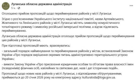 В сообщении ОГА со ссылкой на Украинский институт национальной памяти указано, что «названия Артемовского, Октябрьского и Ленинского районов в городе Луганск содержат символику коммунистического тоталитарного режима и символику российской имперской политики» и, соответственно, подлежат переименованию.