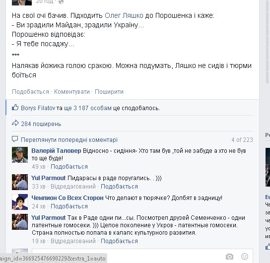 "Своими глазами видел. Подходит Ляшко к Порошенко и говорит: «Вы предали Майдан, вы предали Украину». Порошенко в ответ ему сказал: «Я тебя посажу». Напугал ежа голой ж**ой. Можно подумать, что Ляшко не сидел в тюрьмах", — написал народный депутат Андрей Лозовой.