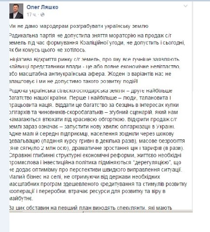 «Радикальная партия не допустила снятия моратория на продажу с/х земель при формировании коалиционного соглашения, не допустит и сегодня, как бы кому этого не хотелось. Инициатива открытия рынка с/х земель, о которой все громче заявляют высшие представители власти - это либо полное экономическое невежество, или масштабная антиукраинская афера. Ни один из вариантов нас не устраивает и мы не допустим такого развития событий!» - говорится в сообщении.