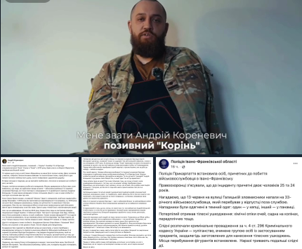 Полиция Ивано-Франковской области подтвердила факт нападения на военного, находившегося в отпуске. У него зафиксированы химические ожоги глаз, ссадины на коленях и предплечьях. При этом, по данным правоохранителей, к инциденту причастны не четверо, а двое молодых людей 24 и 25 лет. Их местонахождение «установлено», о задержании ничего не говорится.