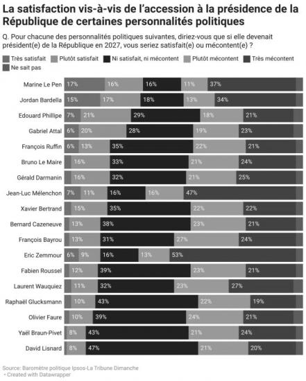 Издание приводит один из опросов, согласно которому два крайне правых политика - Марин ле Пен и ее соратник Жордан Барделла - являются самыми популярными претендентами на президентский пост (выборы президента Франции состоятся в 2027 году).