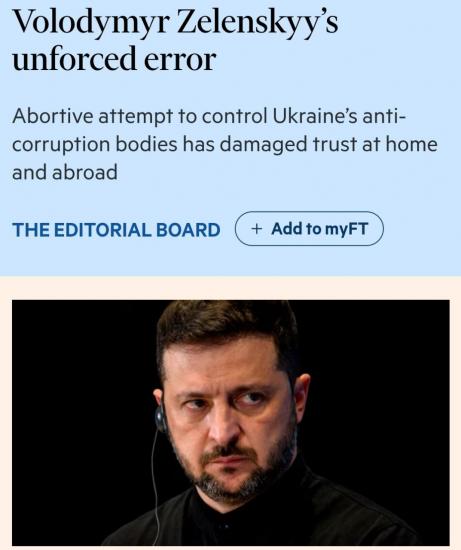 Financial Times в редакционной статье пишет, что попытка Зеленского лишить антикоррупционные органы полномочий "подорвала доверие к президенту внутри страны и за её пределами".