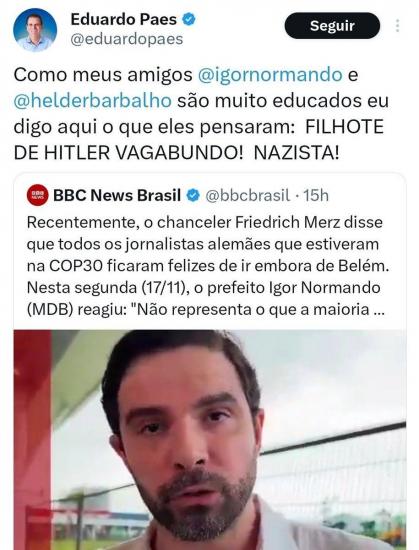 А мэр Рио-де-Жанейро Эдуарду Паэс назвал Мерца в X «сыном Гитлера», «мерзавецем» и «нацистом». Вскоре он удалил этот пост и написал вместо него: «Это был мой способ сегодня выпустить пар. Оставайтесь спокойными в МИДе. Да здравствует дружба между Бразилией и Германией».
