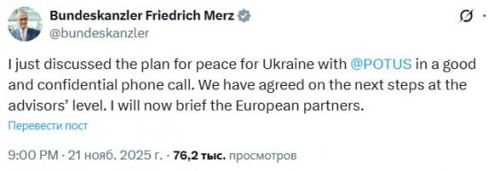 Мы договорились о дальнейших шагах на уровне советников. Я сейчас проинформирую европейских партнёров», - написал немецкий канцлер в Х.