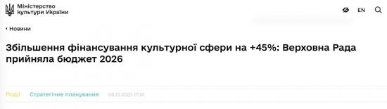 Миллиарды на телемарафон: в статье по «расходам на культуру» в госбюджете-2026 заложено на 45% больше средств, чем в текущем году, - 16,1 миллиарда грн, - Минкульт