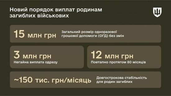 Семьи будут получать 3 млн грн сразу, а остальные 12 млн грн — поэтапно в течение 80 месяцев.