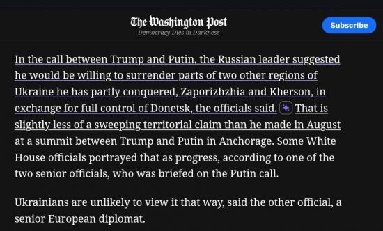 Как видим, в цитате не уточняется, от какой именно части Запорожской и Херсонской области готов отказаться Путин - контролируемой Россией или Украиной (напомним - передача России всей территории Донецкой, Луганской, Запорожской и Херсонской областей провозглашается Москвой ещё с прошлого года в качестве условия прекращения огня). Но, по логике речь идет, вероятно, о подконтрольной Киеву части - поскольку это было предложением российского президента еще на Аляске. Там он, по данным СМИ, заявил Трампу о готовности отказаться от требований передачи всей территории Запорожской и Херсонской областей. Но оставил требование передачи всей территории Донецкой области.
