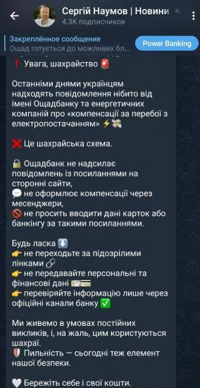 Преступники проводят информационные рассылки, в которых обещают людям "компенсации за перебои с энергопоставками" якобы от Ощадбанка и энергетических компаний, что актуально во время тотальных отключений света и тепла.