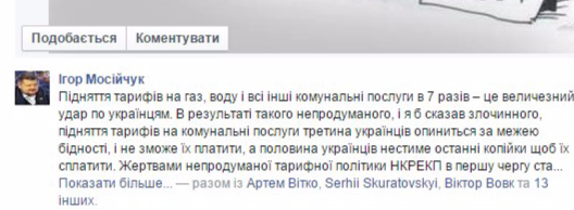 "Підняття тарифів на газ, воду і всі інші комунальні послуги в 7 разів – це величезний удар по українцям. В результаті такого непродуманого, і я б сказав злочинного, підняття тарифів на комунальні послуги третина українців опиниться за межею бідності, і не зможе їх платити, а половина українців нестиме останні копійки щоб їх сплатити. Жертвами непродуманої тарифної політики НКРЕКП в першу чергу стануть самі незахищені верстви населення: пенсіонери, вчителі, лікарі, та інші працівники бюджетних сфер. Інакше як тарифним геноцидом це назвати не можна.