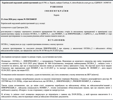 Женщина-трансгендер подала в суд на ТЦК; Харьковский суд признал решение ТЦК незаконным и обязал исключить ее из воинского учёта и реестра "Обериг", так как женщины служат только добровольно.