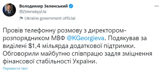 "Провел телефонный разговор с директором-распорядителем МВФ Кристалиной Георгиевой. Поблагодарил за выделенные $1,4 миллиарда дополнительной поддержки. Обсудили будущее сотрудничество по укреплению финансовой стабильности Украины", – написал он.