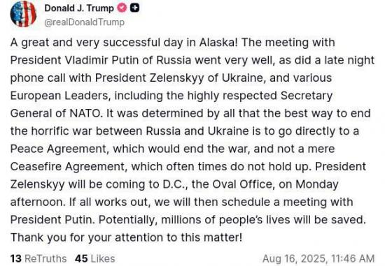 «Отличный и очень успешный день на Аляске! Встреча с президентом России Владимиром Путиным прошла очень хорошо, как и поздний ночной телефонный разговор с президентом Украины Зеленским и различными европейскими лидерами, включая уважаемого Генерального секретаря НАТО.