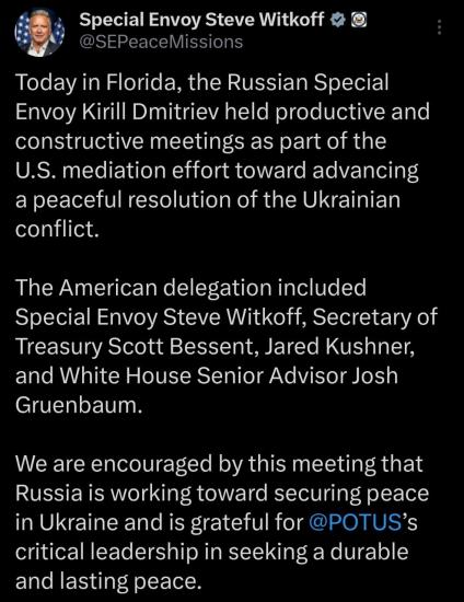 "Мы воодушевлены этой встречей и тем, что Россия работает над обеспечением мира в Украине, и благодарны президенту США за его ключевое лидерство в стремлении к прочному и устойчивому миру", - заявил Уиткофф.
