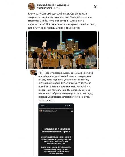 Военного ВСУ, который планировал выйти на Майдан и призывал к протесту против низких зарплат (большинство мобилизованных получает всего 20 000 грн) и против законопроекта о наказании за СЗЧ, задержала в части СБУ: «Провёл вечер в компании службы безопасности Украины. Знайте, что военным нельзя собирать митинги, поэтому, возможно, мне ничего не будет, потому что я не появился на майдане».