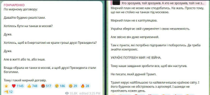 "Мирный план не может понравиться нам. К сожалению. Просто потому, что мы не стоим на танках под Москвой. Мирный план не капитуляция. Украина сохраняет свой суверенитет и независимость. Но, конечно, он очень неприятен. Там есть пункты, которые нужно подправить и побороться. Где нужно найти компромисс. Украине нужен мир, а не война. Поэтому наша задача сделать все, чтобы он наступил. Не писать, какой глупый Трамп. Трамп управляет самой большой и величайшей страной мира. И его здание не обстреливают из артиллерии. И шахеды не прилетают каждый день", - пишет Гончаренко.