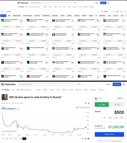 На международной букмекерской платформе Polymarket на сегодняшний день открыты десятки ставок по теме войны в Украине