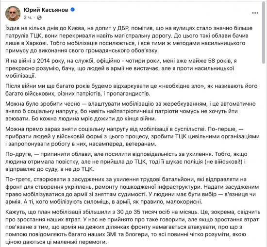 «То есть мобилизация усиливается, и всё теми же методами насильственного принуждения к выполнению своего гражданского долга. После войны мы еще много лет будем отхаркивать это «необходимое зло», как называют его многие военные, разные патриоты и пропагандисты», - пишет Касьянов.