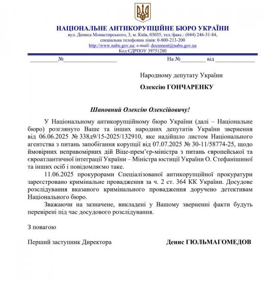 НАБУ расследует уголовное производство в отношении вице-премьера Стефанишиной, которая сегодня была отправлена в отставку и временно стала и.о.