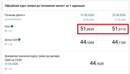 Сильнее всего на удорожание евровалюты в Украине играет повышение курса гривна/доллар (через него пересчитываю евро), где НБУ поднял свой официальный курс с 44,1004 грн/$ до 44,1160 грн/$.