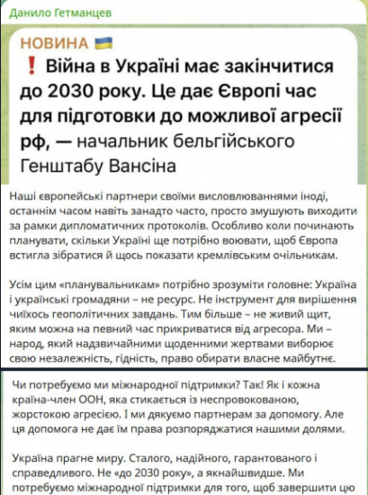 Нардеп Даниил Гетманцев раскритиковал заявление начальника Генштаба Бельгии о том, что Европе выгодно затягивание войны в Украине до 2030 года