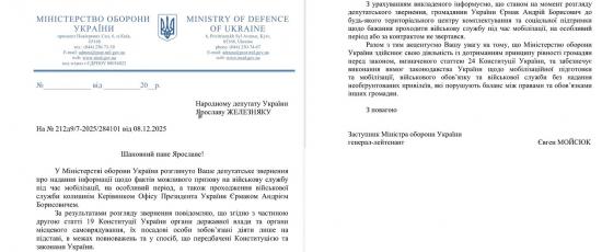 «Информируем, что по состоянию на момент рассмотрения депутатского обращения… гражданин Украины Ермак Андрей Борисович в любой территориальный центр комплектования и социальной поддержки по желанию проходить военную службу во время мобилизации на особый период или за контрактом не обратился», - говорится в ответе Минобороны.