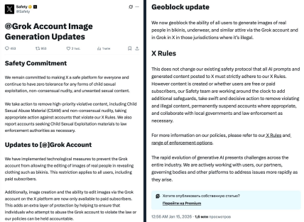 «Мы приняли меры, чтобы Grok не позволял редактировать изображения реальных людей и изображать их в откровенной одежде, такой как бикини. Это ограничение распространяется на всех пользователей, включая платных подписчиков», — говорится в объявлении.
