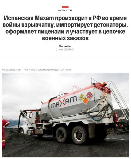 Несмотря на санкции, один из крупнейших производителей взрывчатых веществ в мире - испанская компания Maxam - производит в РФ взрывчатку и ввозит детонаторы через третьи страны, - расследование The Insider